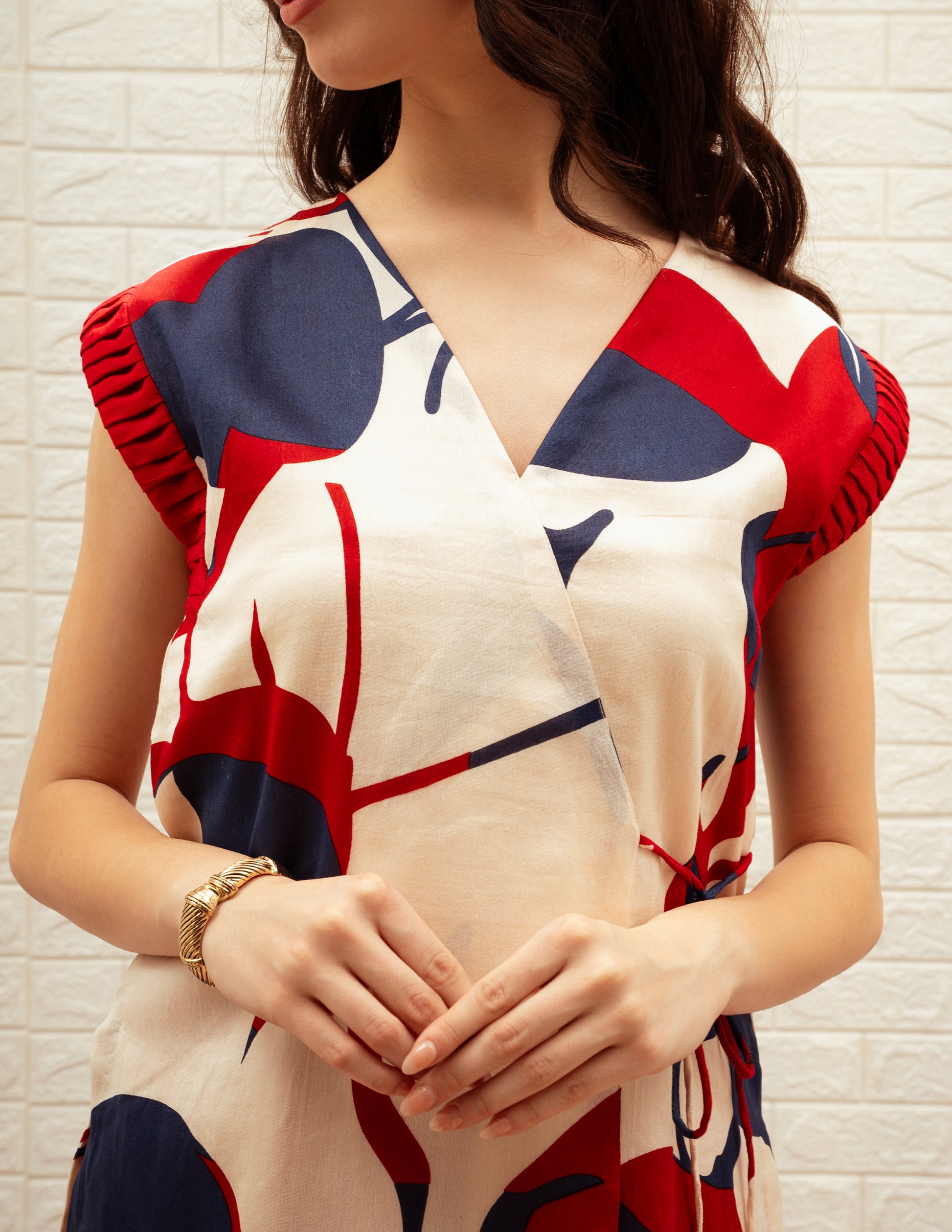 This statement coordinated set pairs high-waist solid red Chanderi pants with an Angrakha-style long top in a vibrant red, white, and blue print. The pants offer ease with a back elastic detail, while the asymmetrical top features a tie-up waist, pleated sleeves, and a breezy silhouette. A contemporary fusion of comfort and standout style for the modern wardrobe.