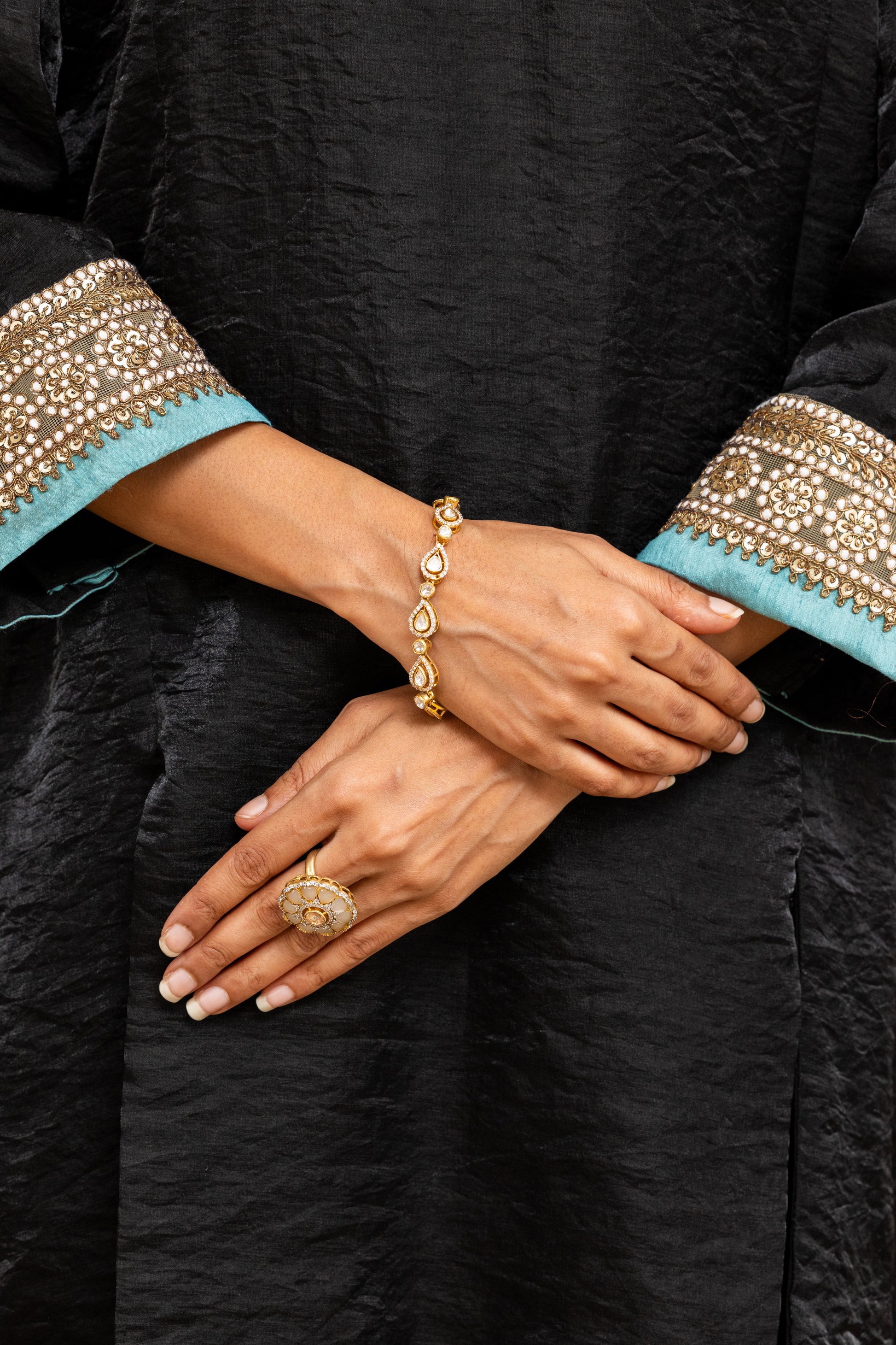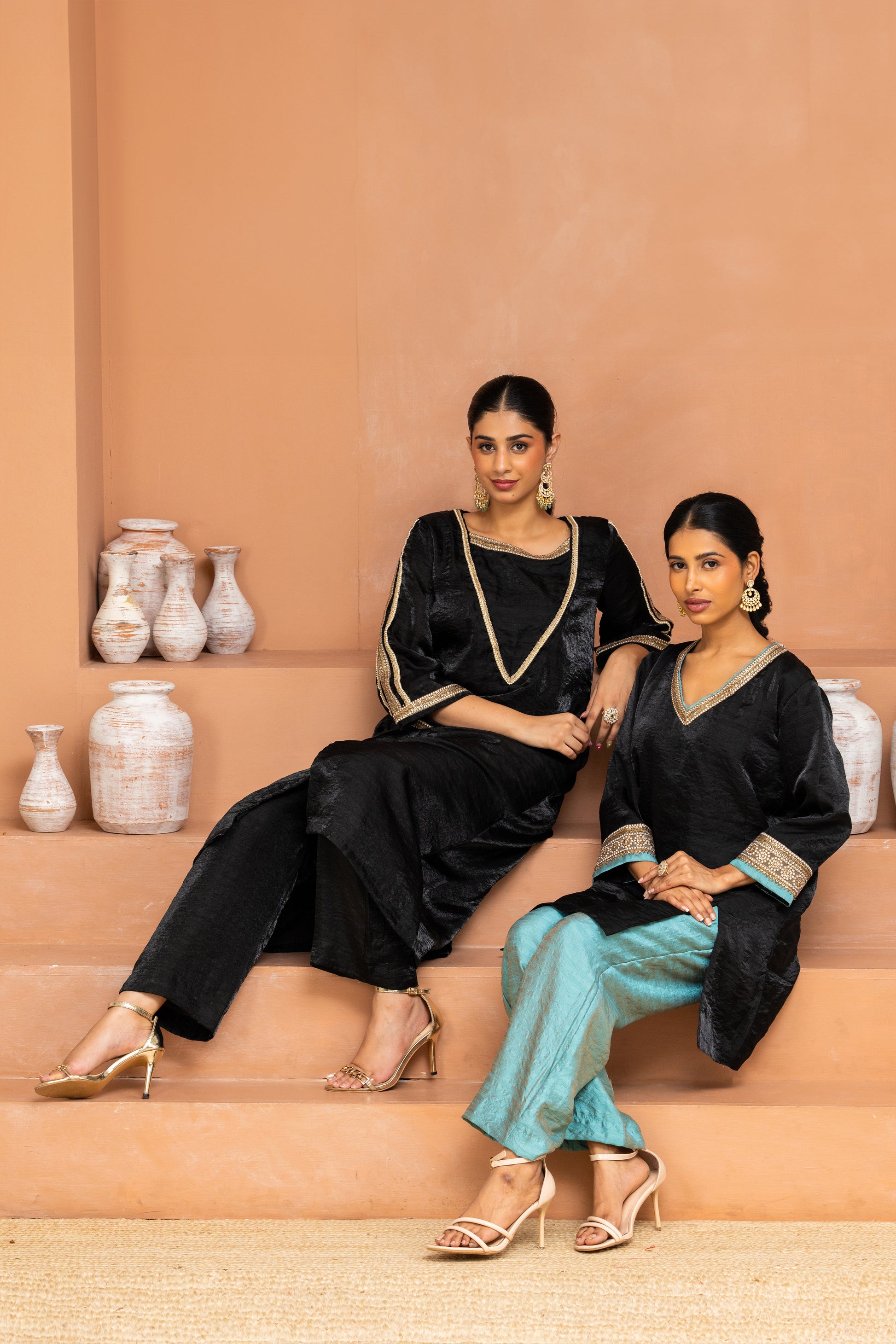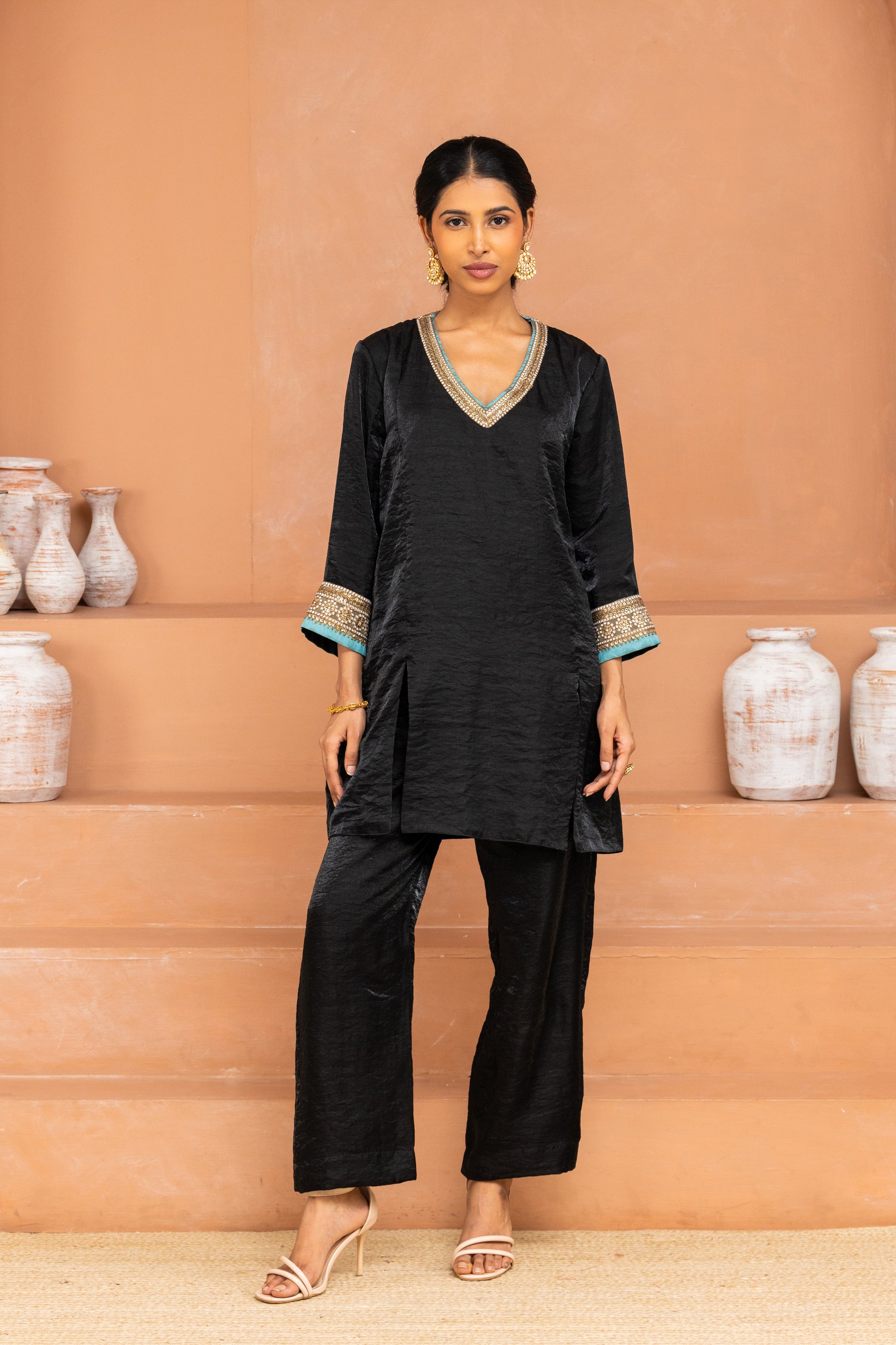 This short black kurta features panels and slits for ease, a rounded V-neckline, and ¾ sleeves. Borders on sleeves and hem are enhanced with a contrasting light blue patti for a pop of freshness. A versatile piece for Diwali brunches or festive errands – chic, sharp, and complete with pockets.