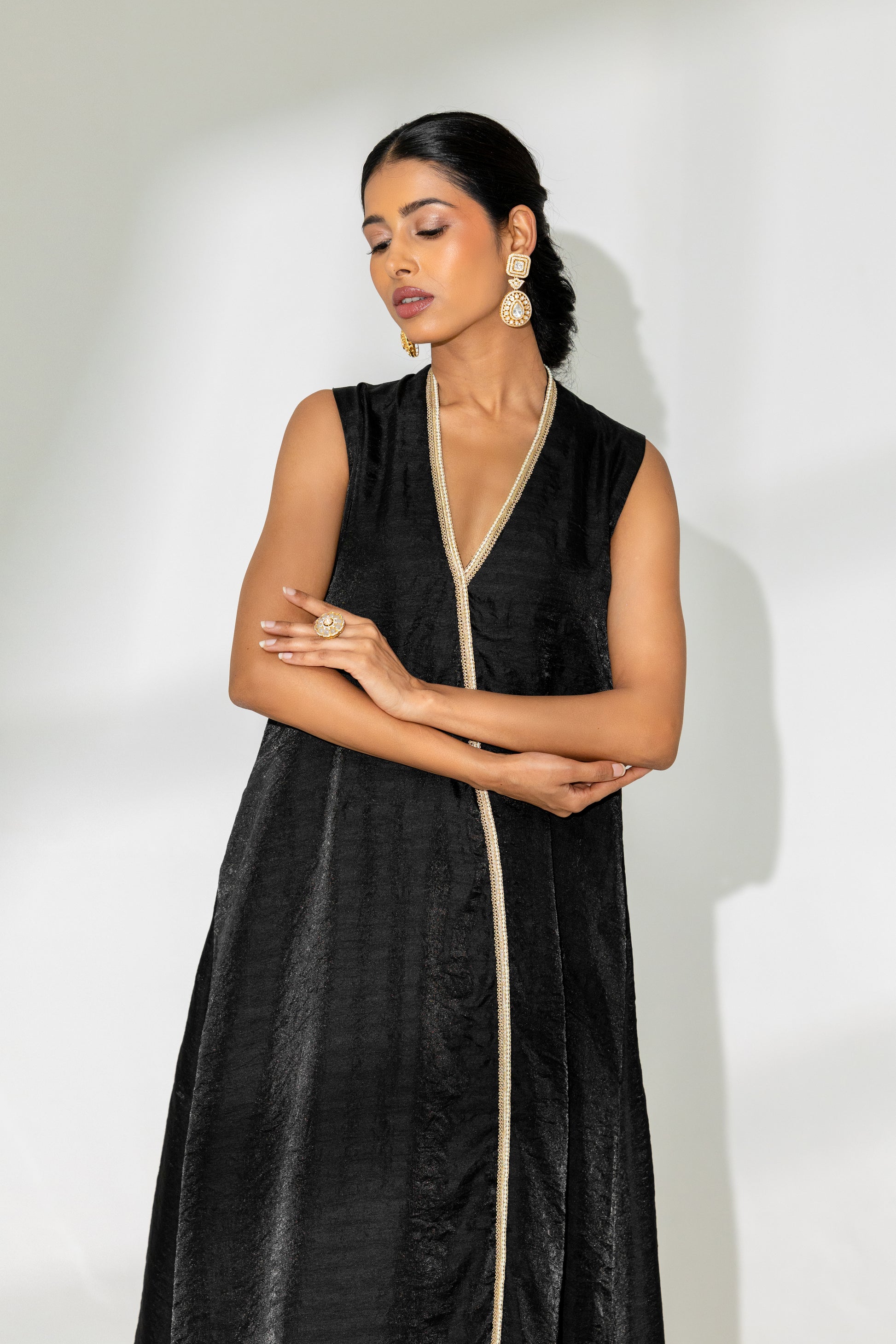 Crafted in classic black, this sleeveless asymmetric kurta features a soft overlap at the front and a beaded lace finish throughout. High-low hems and a structured yet relaxed silhouette create movement and grace. It can be worn as a dress or paired with matching black pants. Includes pockets for modern practicality.