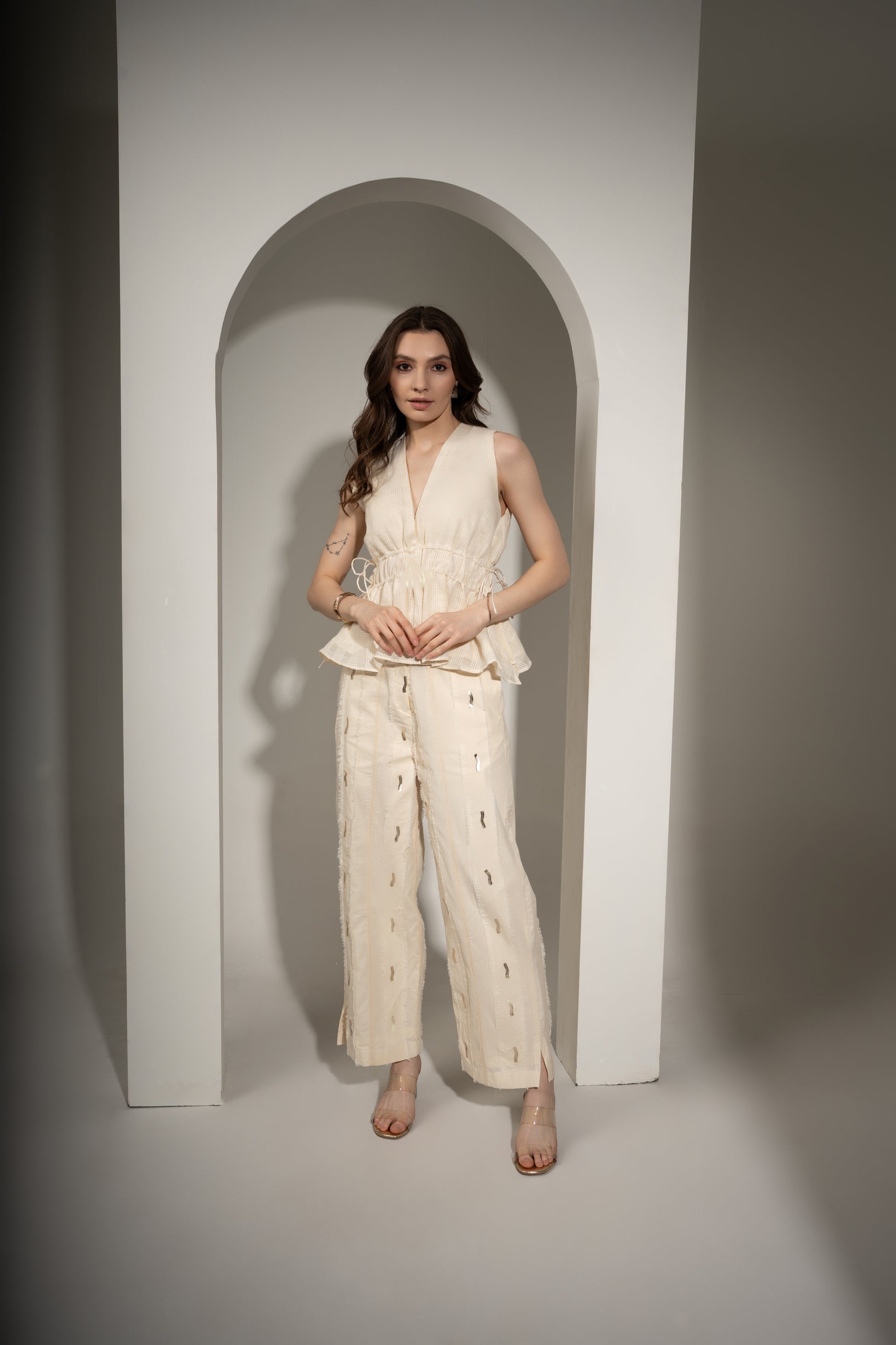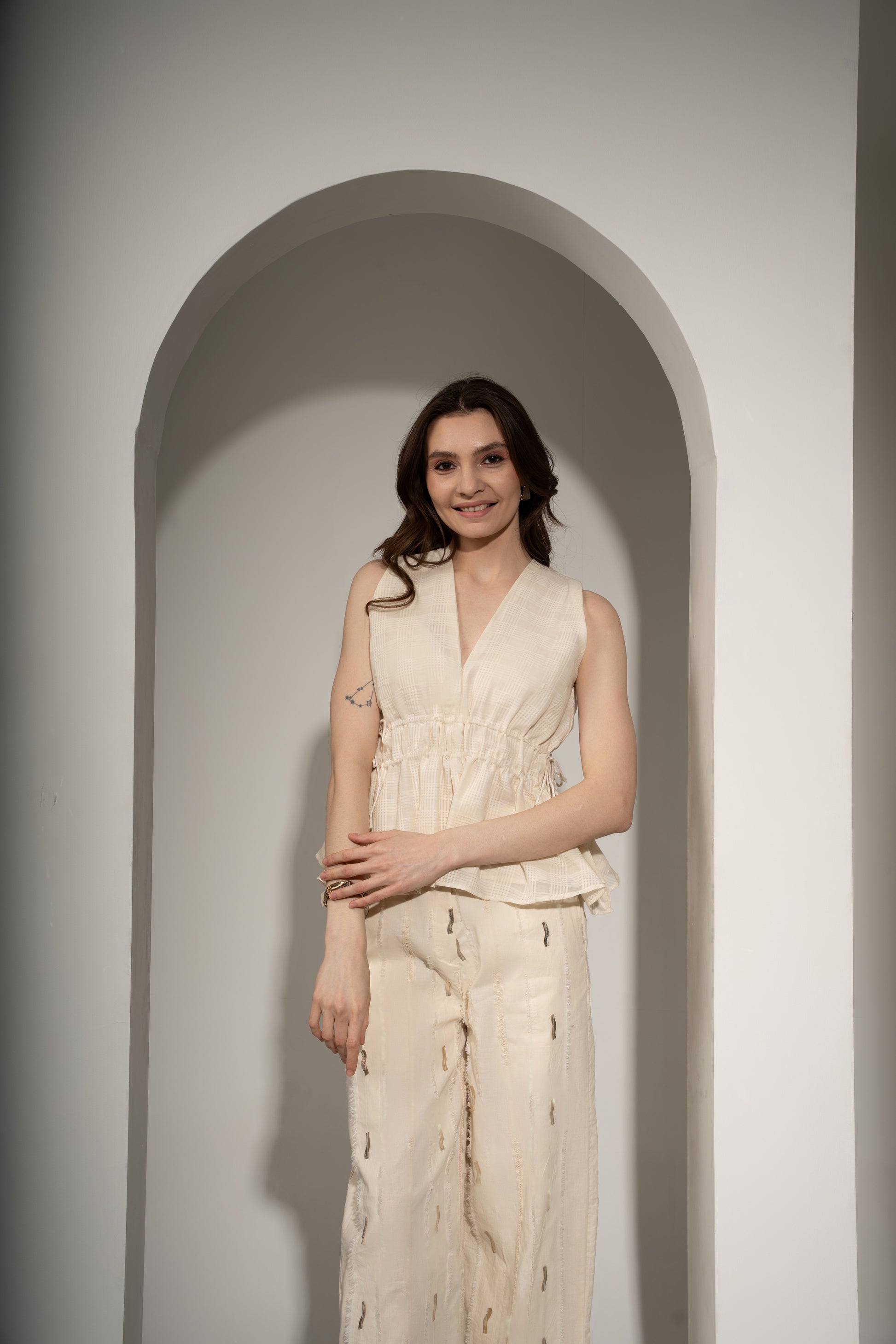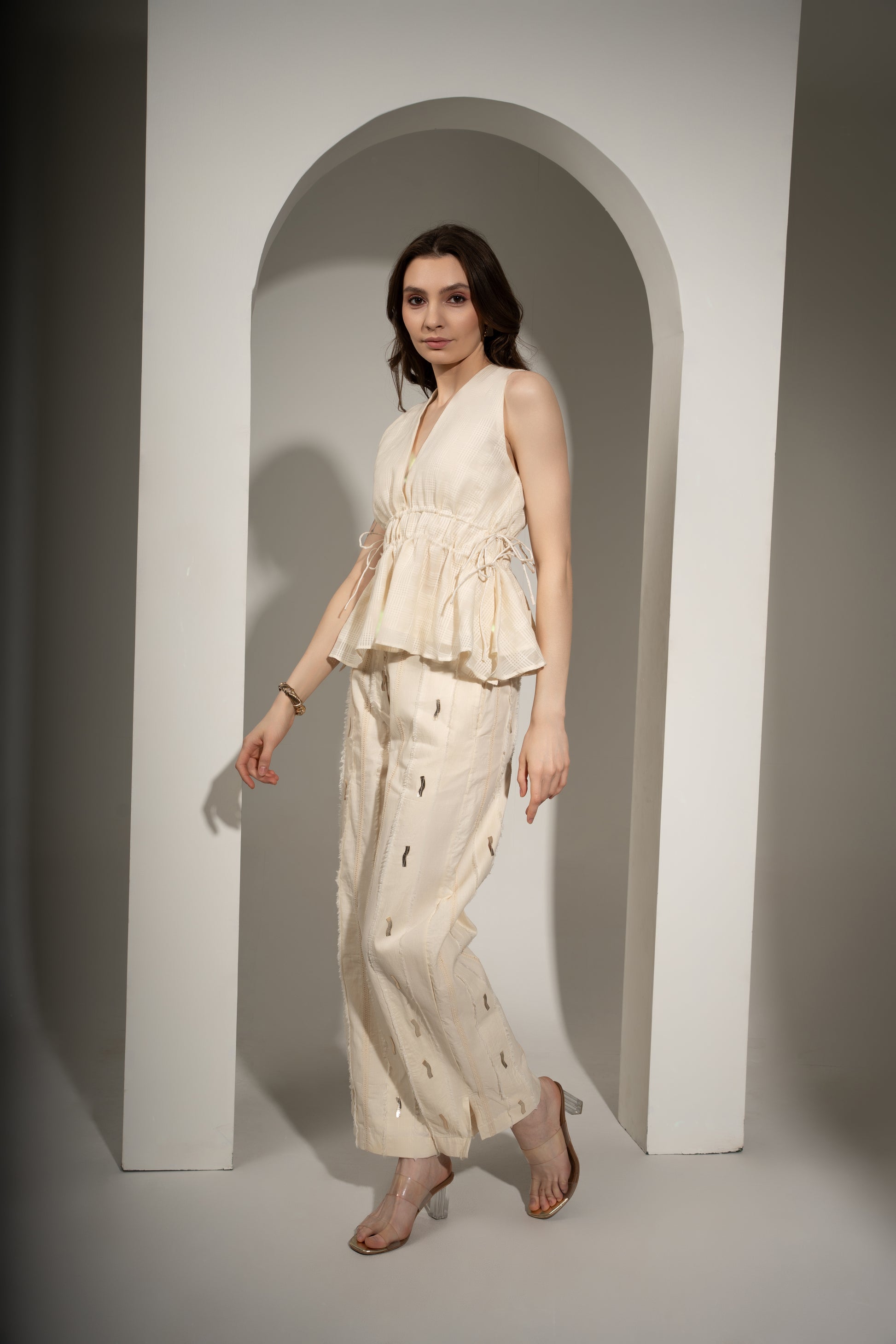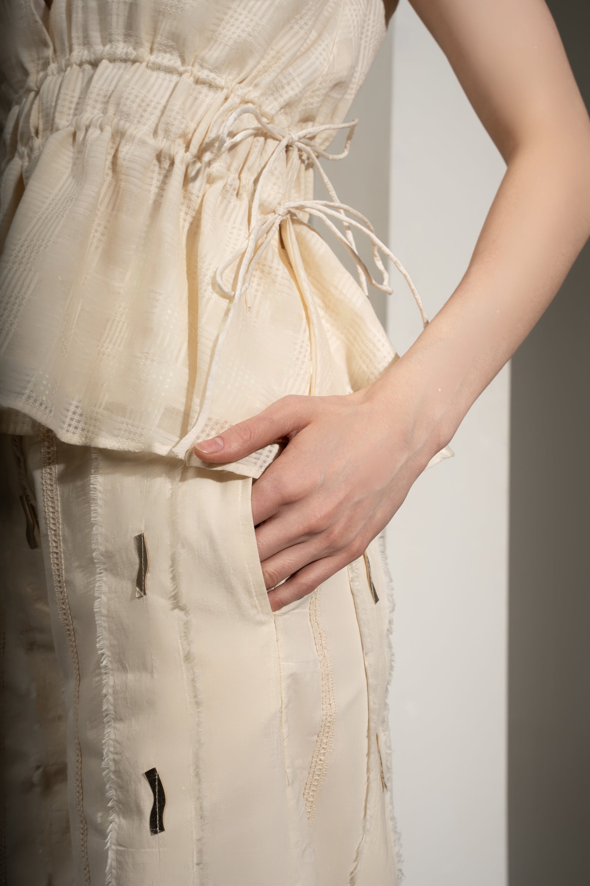 This sleeveless cotton dobby top in off-white self-checks features drawstrings on either side for an adjustable silhouette. Lightweight, versatile, and perfect for layering with textured pants or skirts.