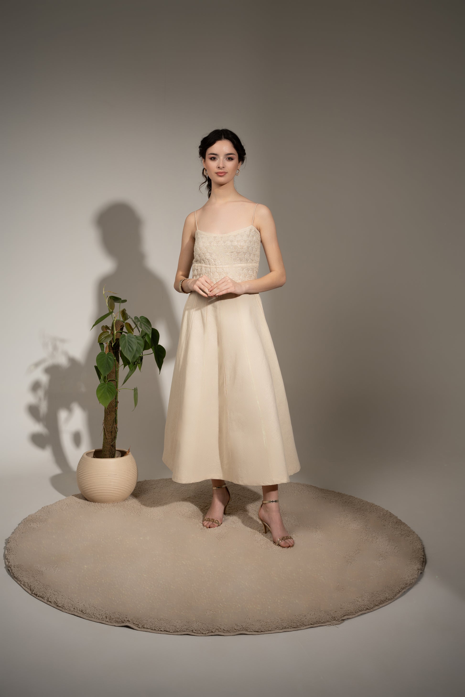 A feminine cotton dress with a flattering fit and flare cut, delicate threadwork on the yoke, and a sleek backless design with an elasticated back. The noodle straps and contoured silhouette make this off-white beauty a perfect day-to-night statement piece.