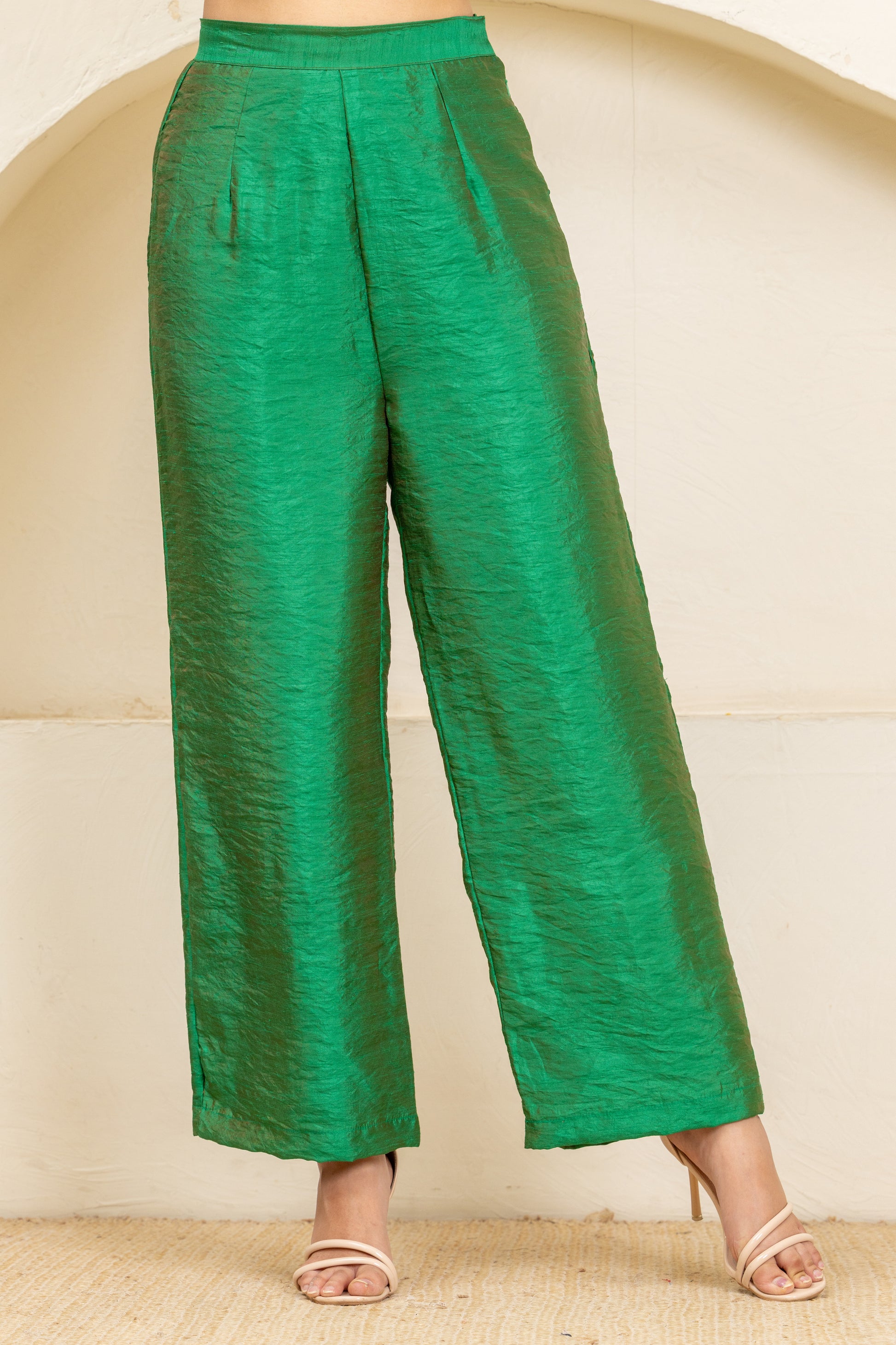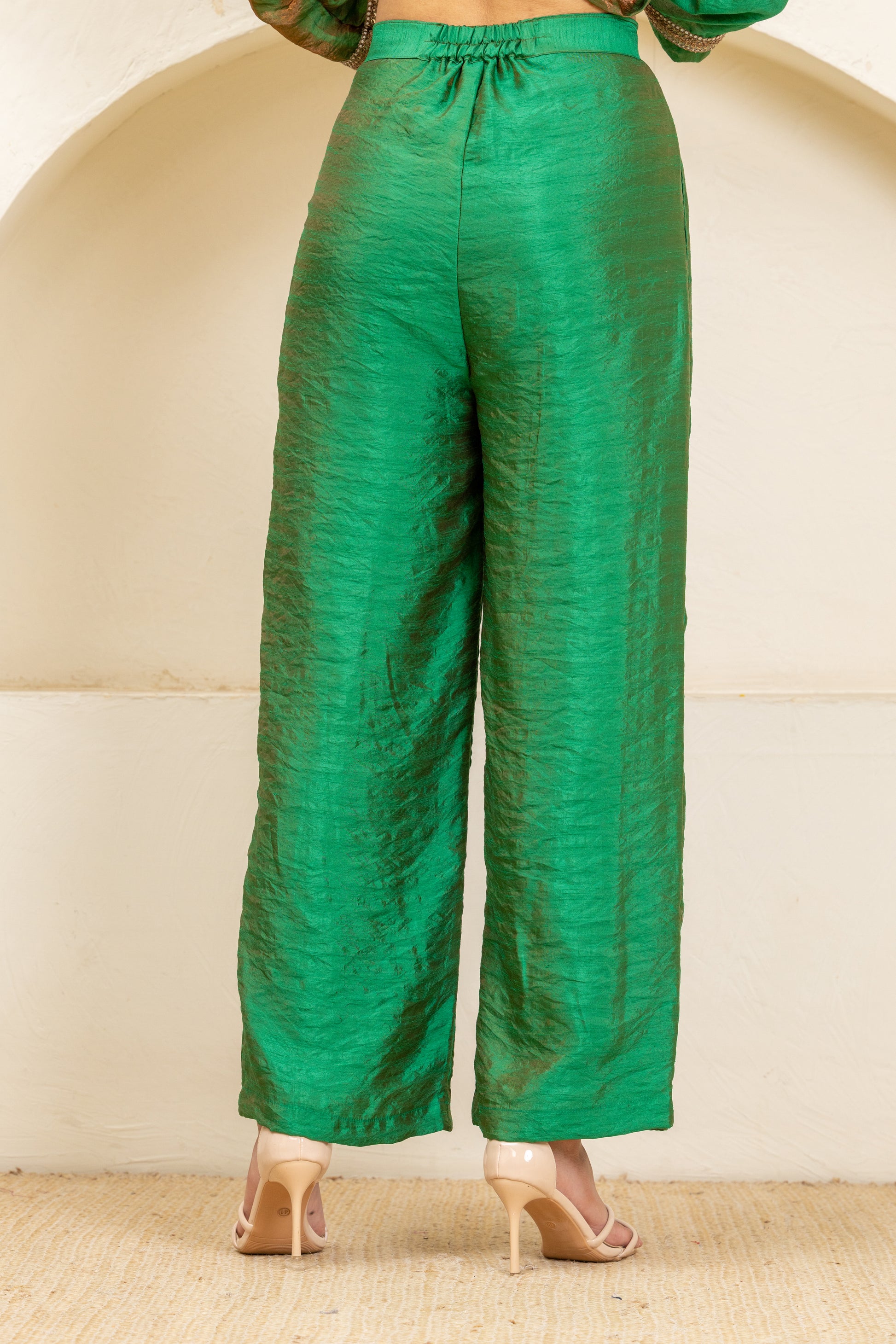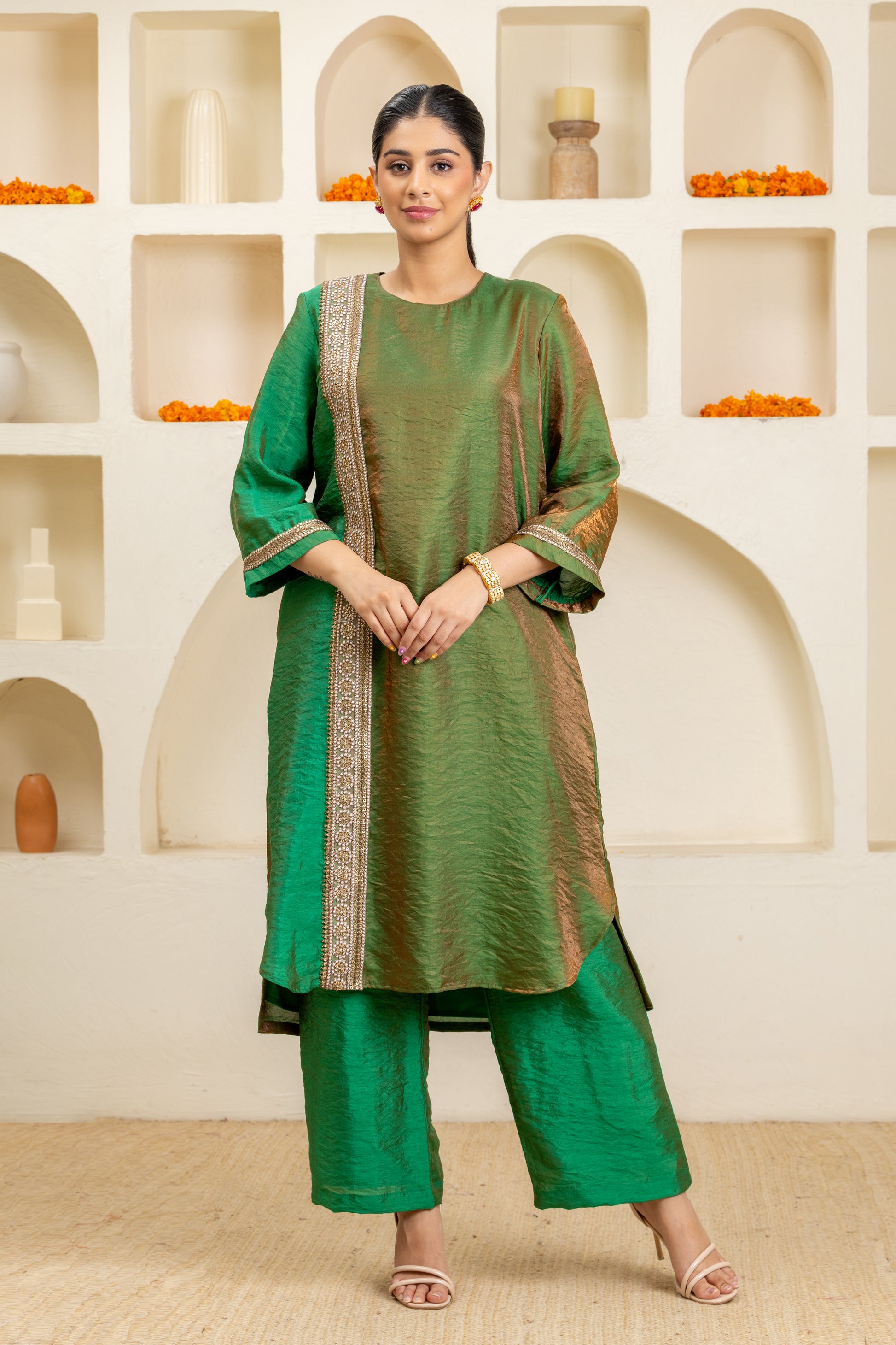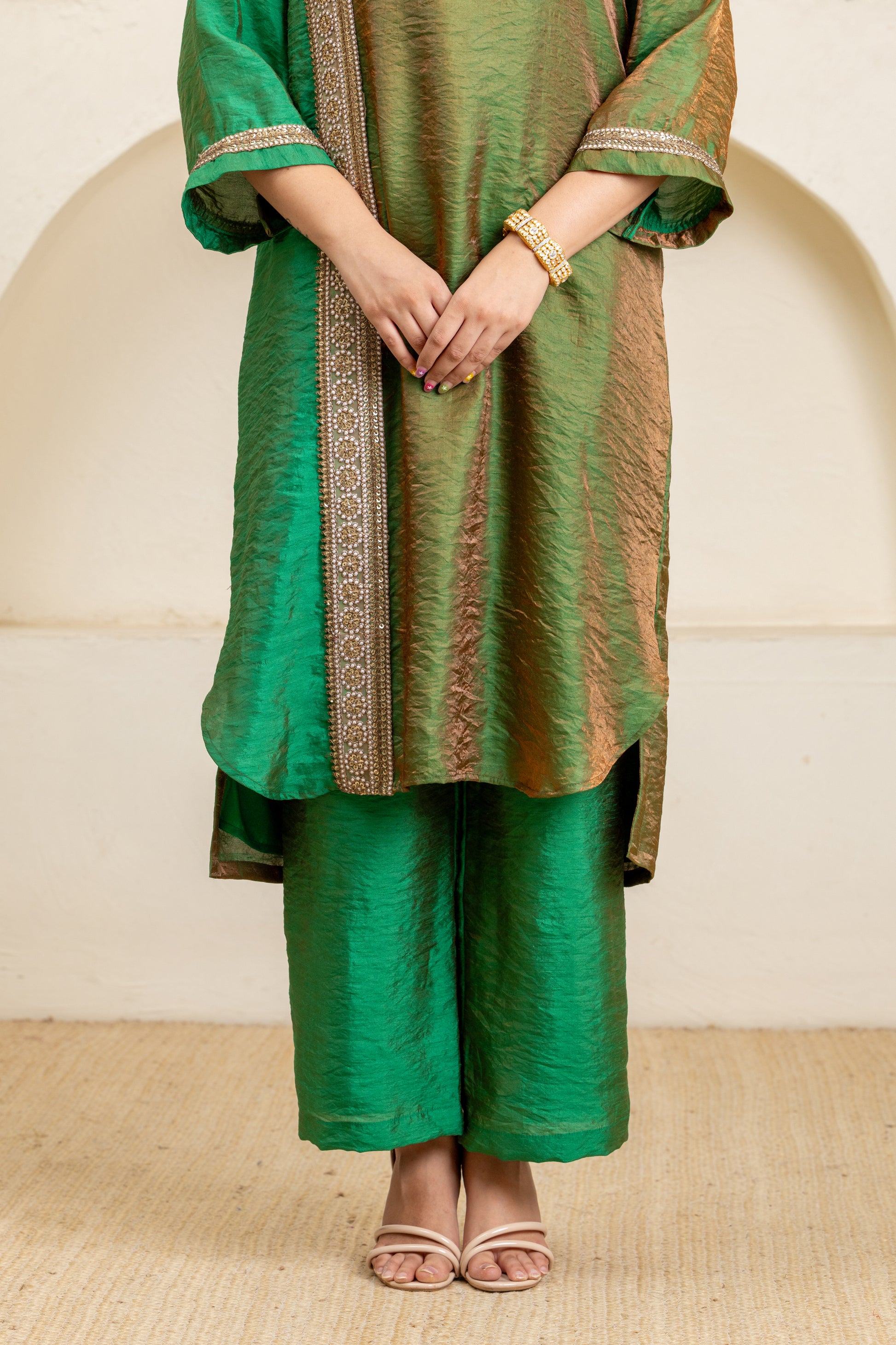 This box-fit panelled green kurta plays with subtle contrasts using the reverse side of the fabric for side panels, joined by a rich border detail. With a flattering, broad, round neckline, a curved front hemline, and structured ¾-length sleeves, it combines comfort with celebration. Pockets add ease and functionality. It comes with complementing pants for a complete festive ensemble.