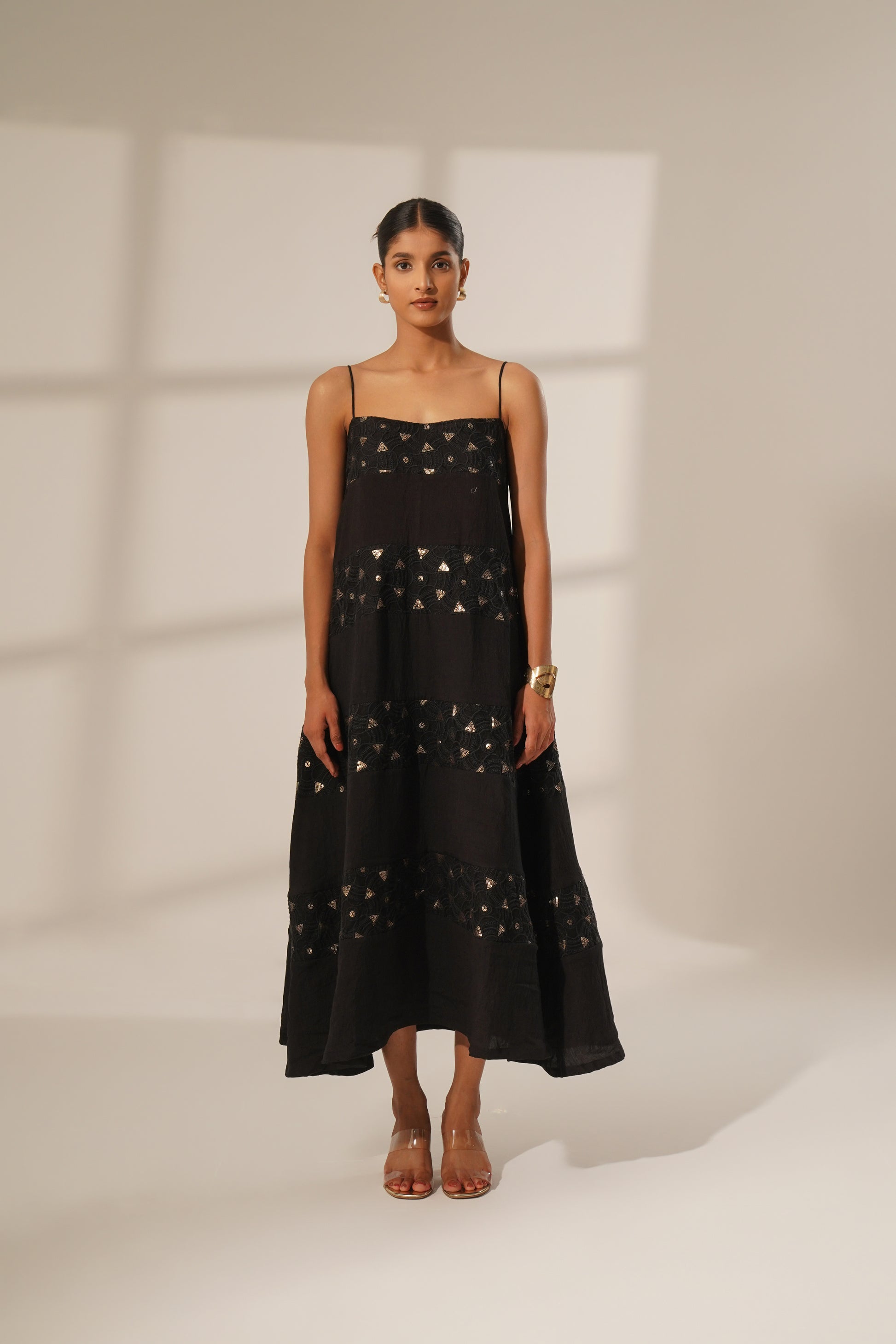 This exquisite panelled dress features alternating horizontal panels of richly embroidered soft net fabric and delicate Chanderi, both known for their lightweight feel. The panelling creates a dynamic contrast between the intricate detailing of the embroidery and the smooth, lustrous texture of the Chanderi. The structured yet flowing silhouette offers both elegance and comfort, perfect for special occasions or upscale events.