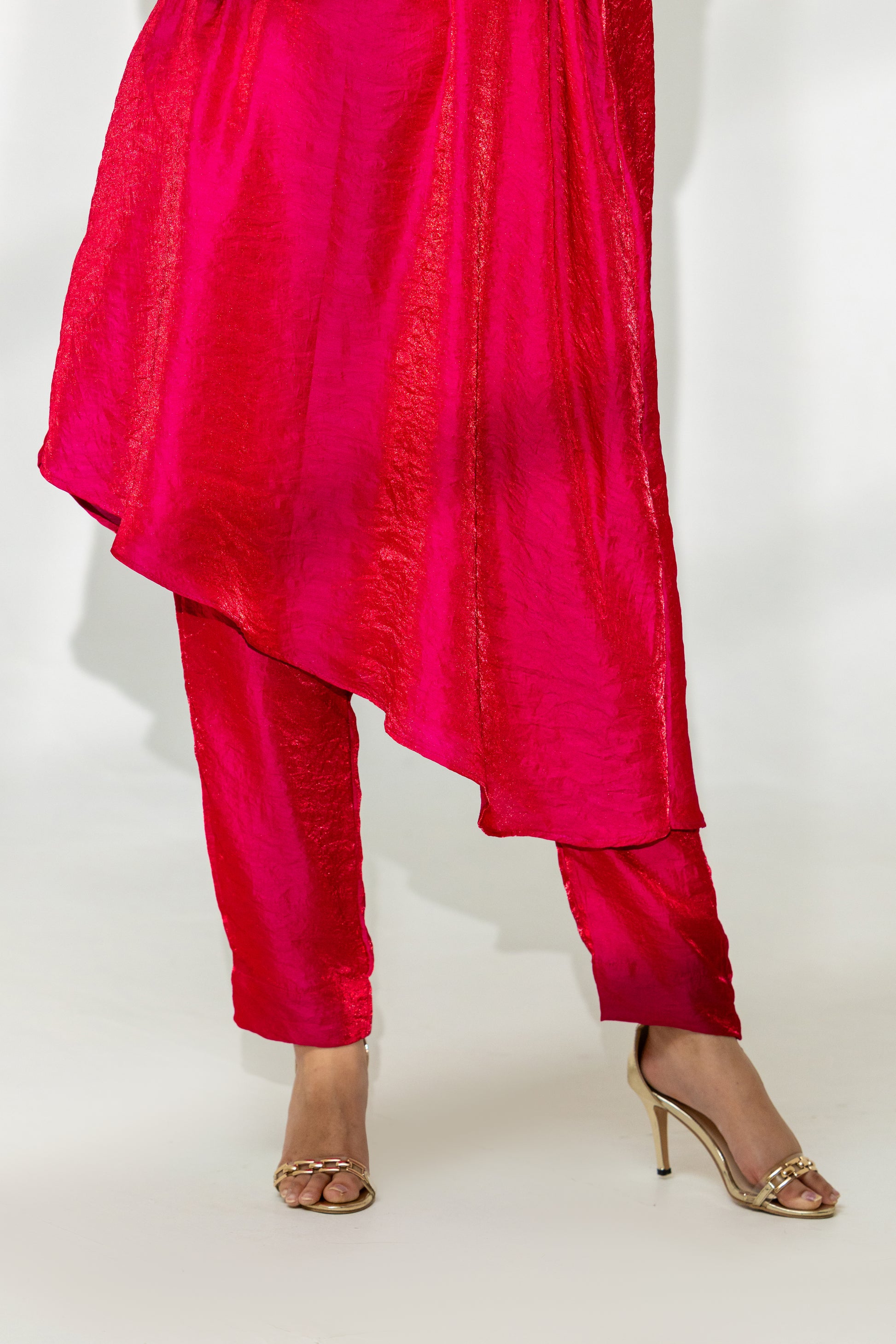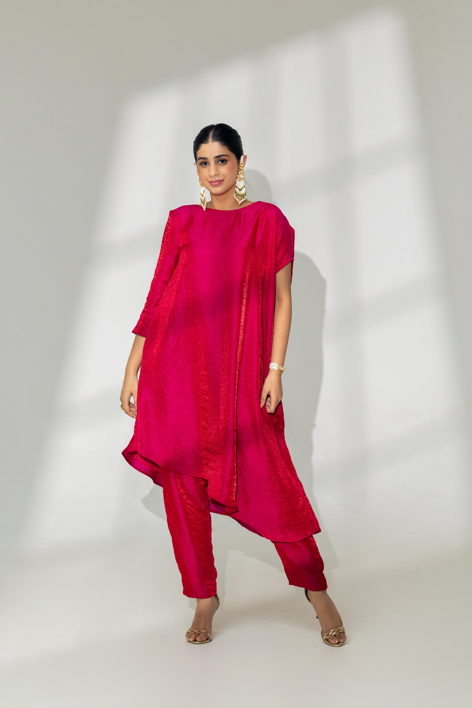 Hot Pink Asymmetrical Kaftan Kurta and Pant Set