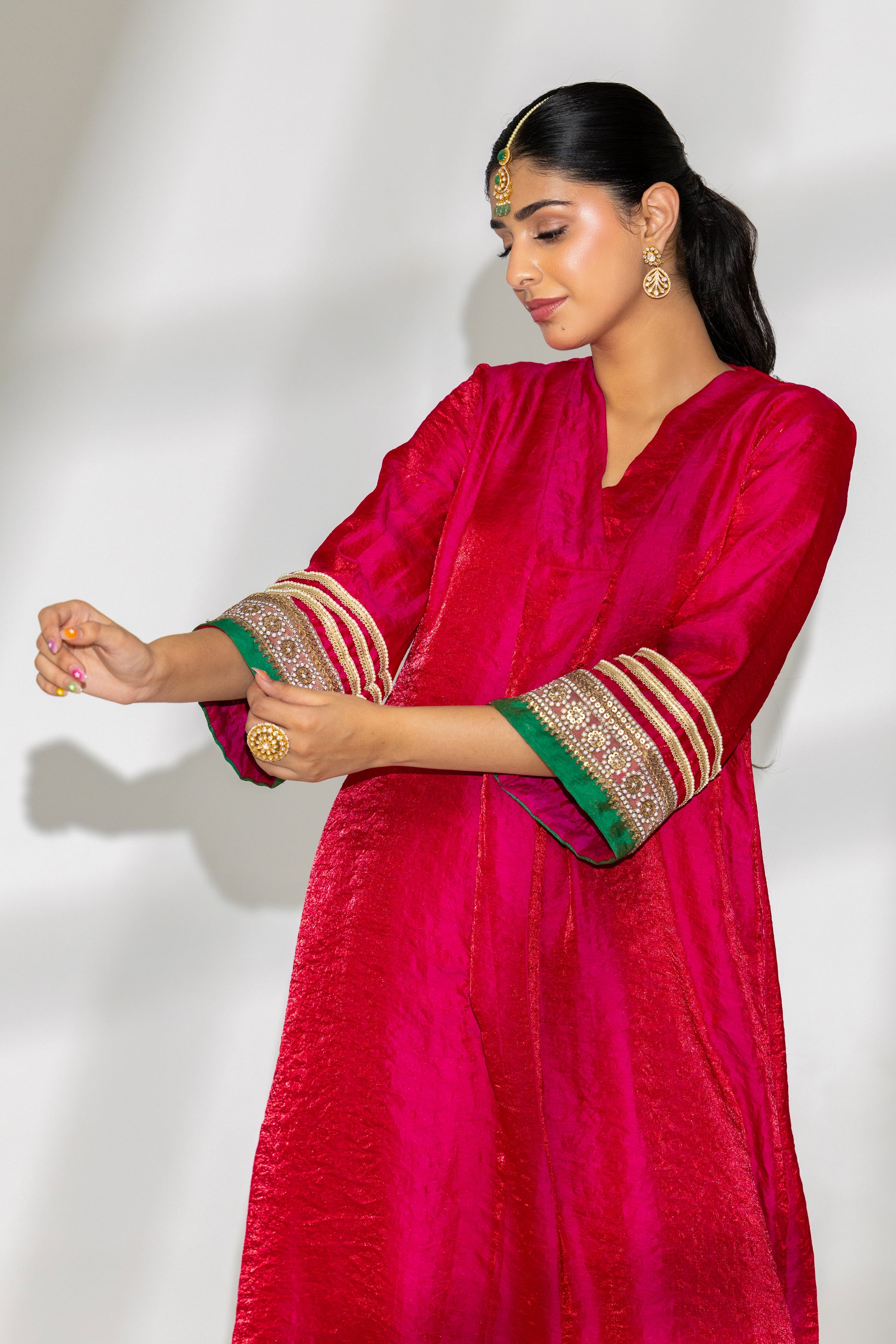 This vibrant pink long kurta features a classic V-neckline and a smart box pleat under the neck for ease without extra flare. Finished with thick festive sleeve borders and a subtle green patti for contrast, it’s perfect for Diwali dinners, pujas, or family functions. Style with narrow bottom pants for a polished, complete look. Of course it has pockets!
