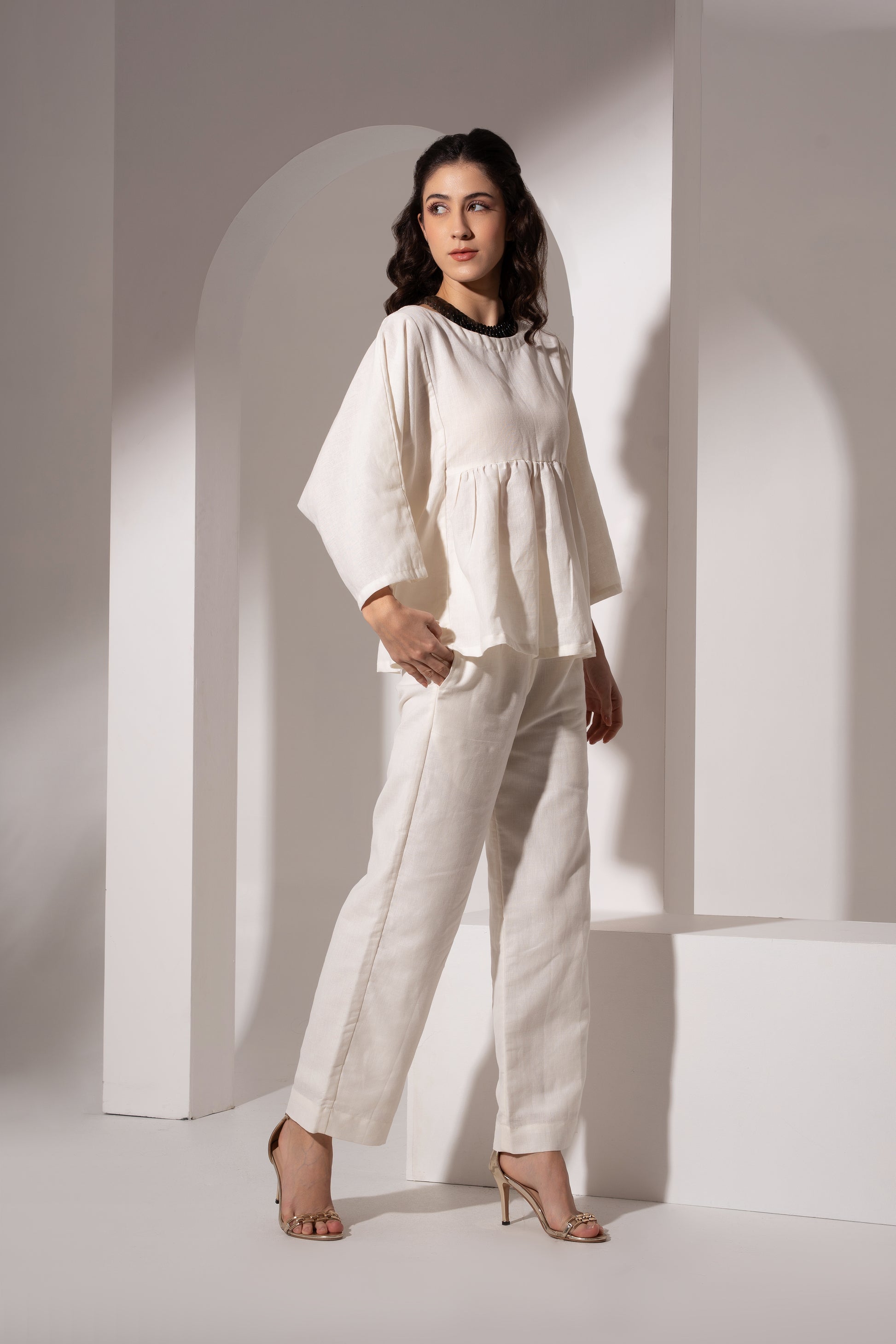 Crafted in off-white linen, this gathered kaftan top is designed for effortless summer dressing. The silhouette is relaxed and breathable, with soft gathers below the bust that allow natural movement and comfort. An adjustable drawstring under the bust ties at the back, letting you personalise the fit with ease. Finished with delicate buttoned tassel ends, the design remains clean and minimal while feeling thoughtfully detailed. Light, airy, and versatile, this linen kaftan top transitions seamlessly from everyday wear to elevated casual occasions.
