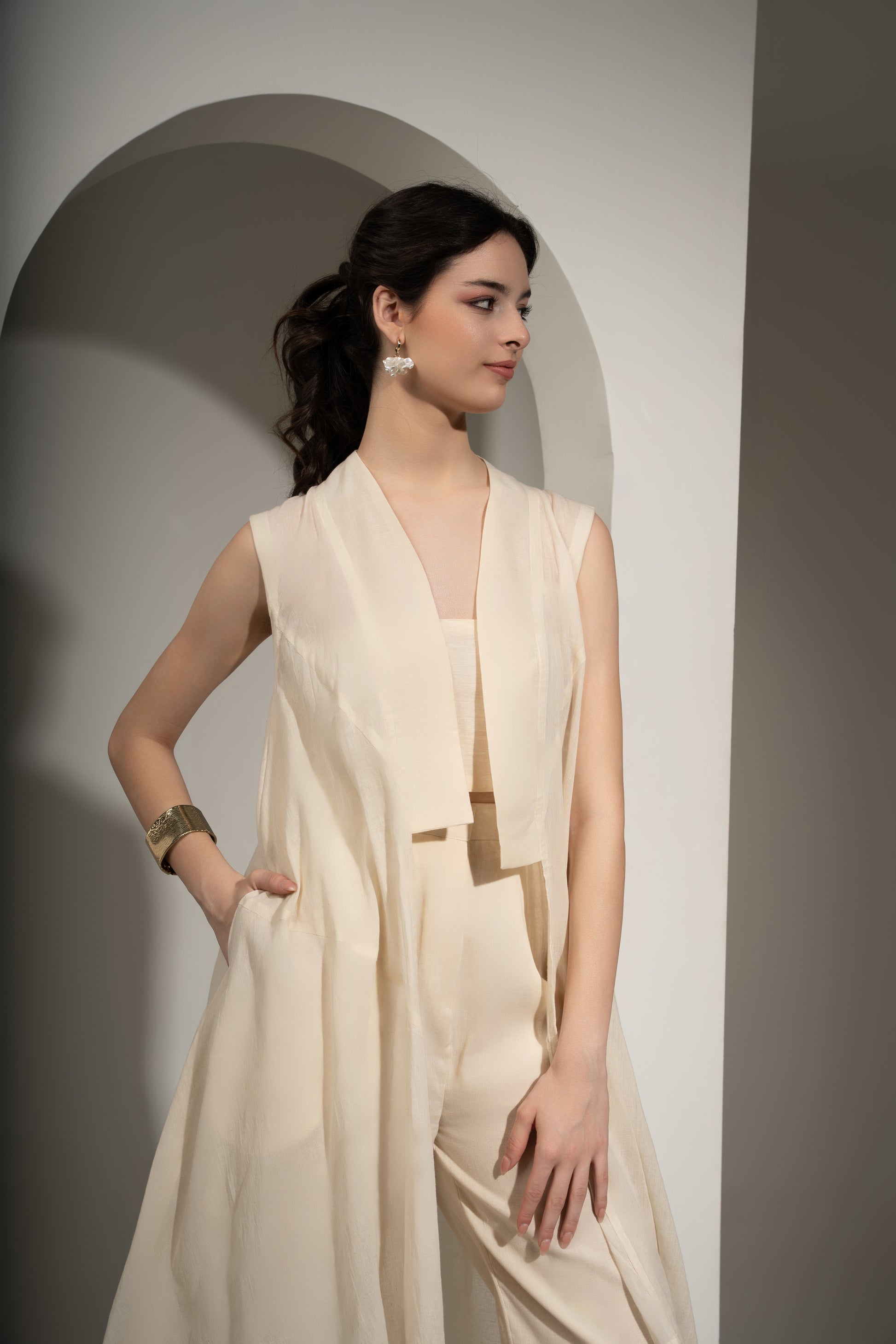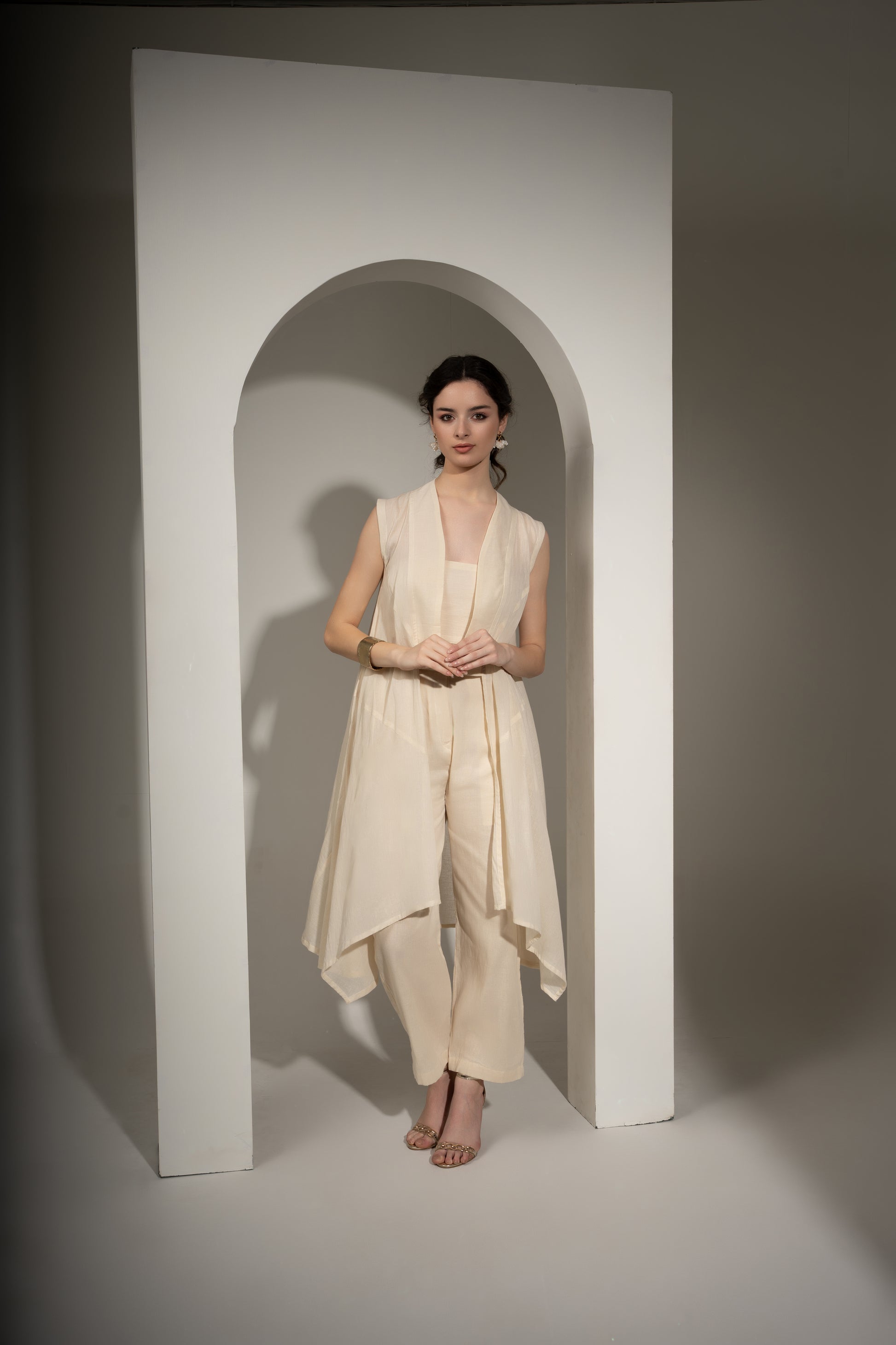 A soft cotton, sleeveless shrug with asymmetric panels in solid off-white, designed to drape effortlessly. Lightweight and fuss-free, it’s a must-have layering piece for every capsule wardrobe.