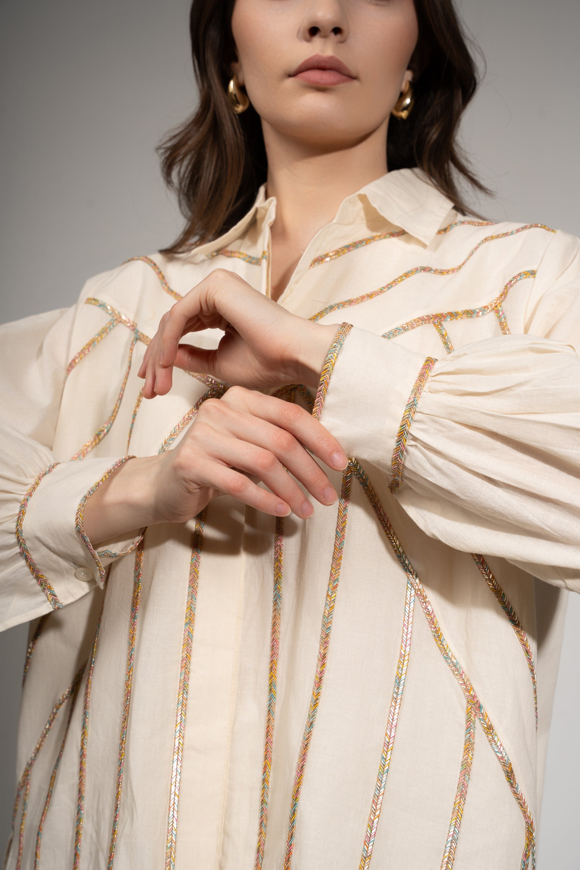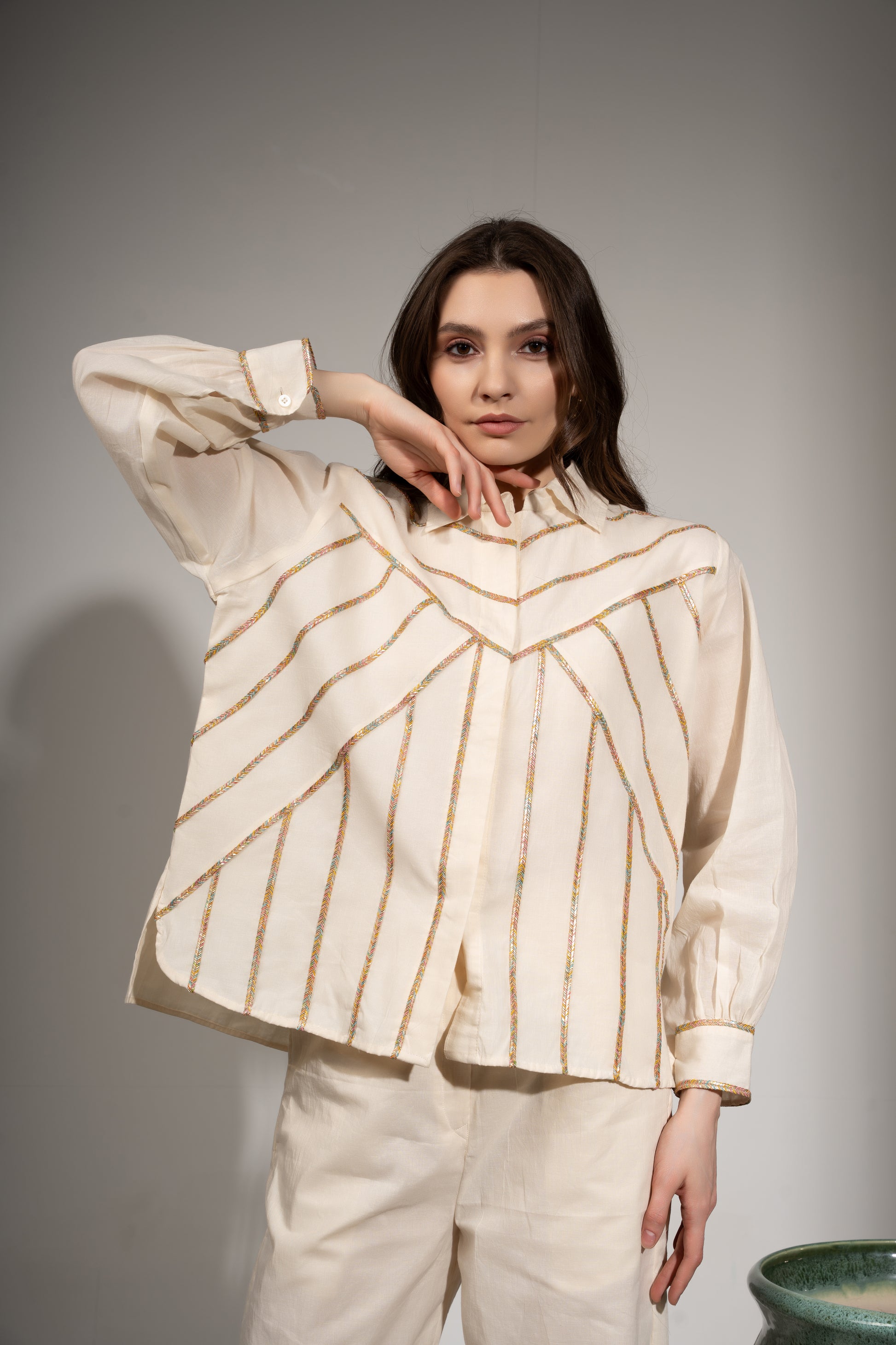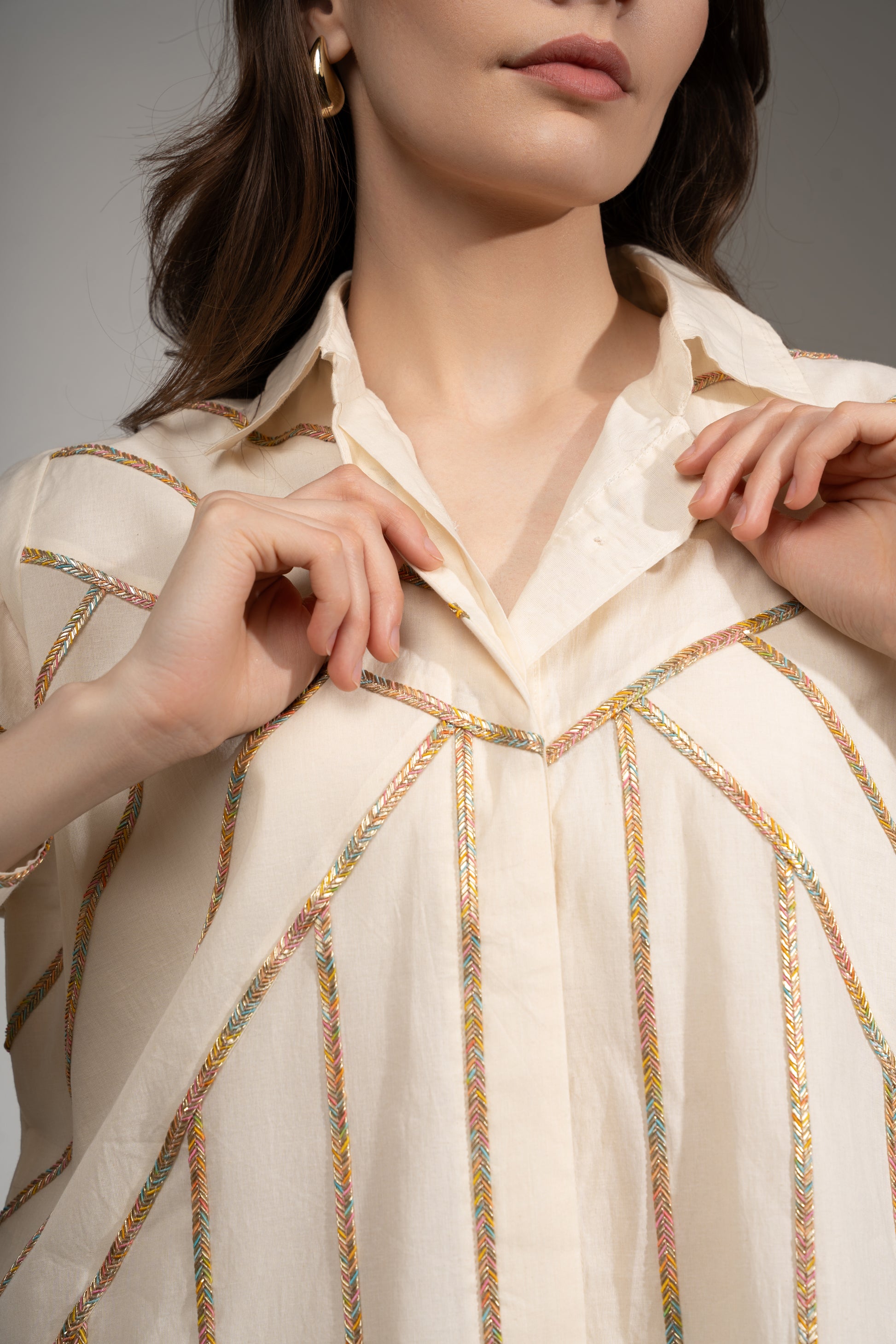 This oversized shirt in cambric cotton is defined by geometric paneling and a slim multicolour border. The off-white base adds a classic touch, while the structure gives it a smart, fashion-forward edge.