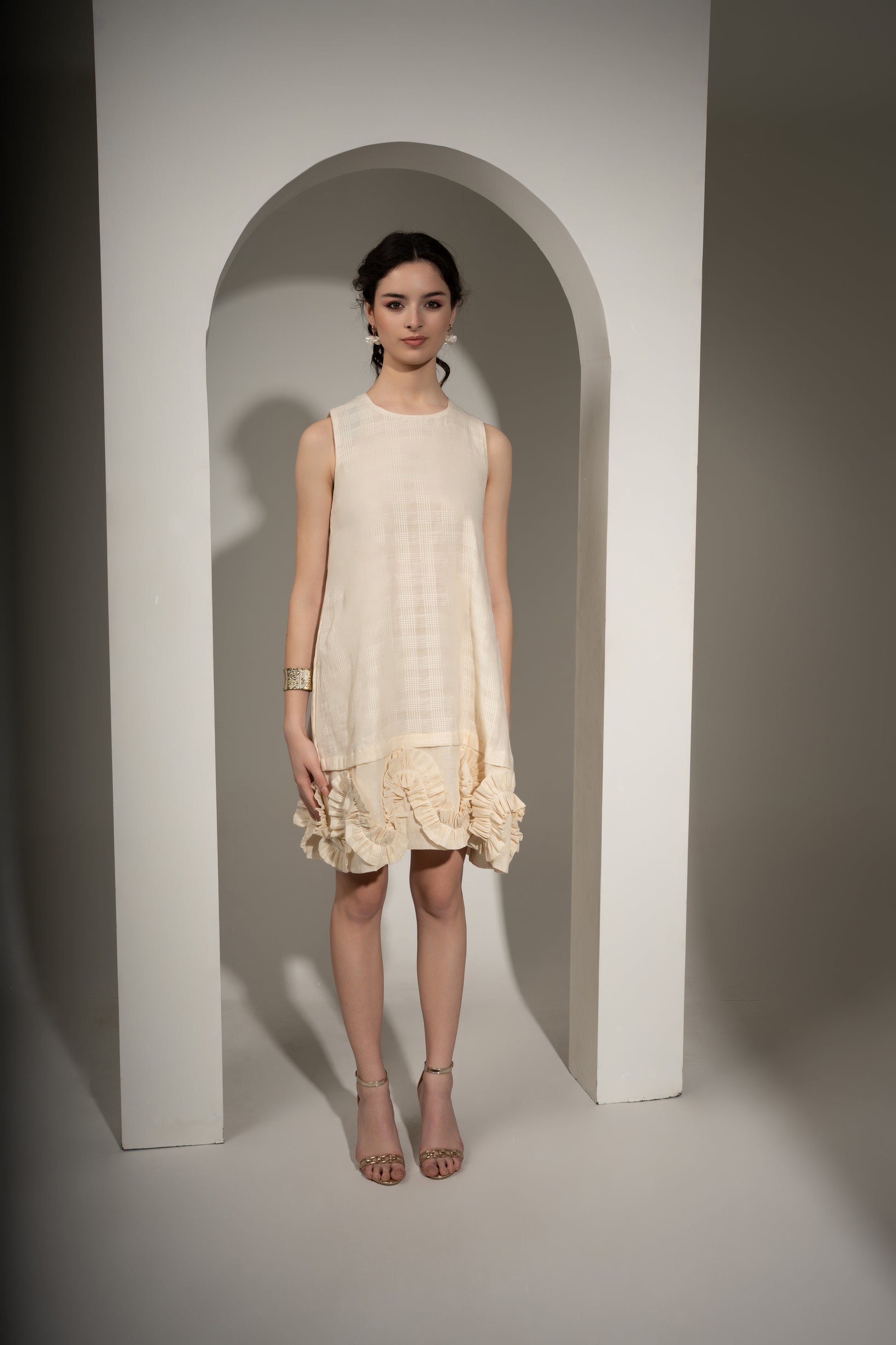 Made from soft cotton dobby checks fabric, this off-white short dress is breezy and playful with a statement ruffle hem. It is ideal for warm days and carefree evenings and adds charm to every step.