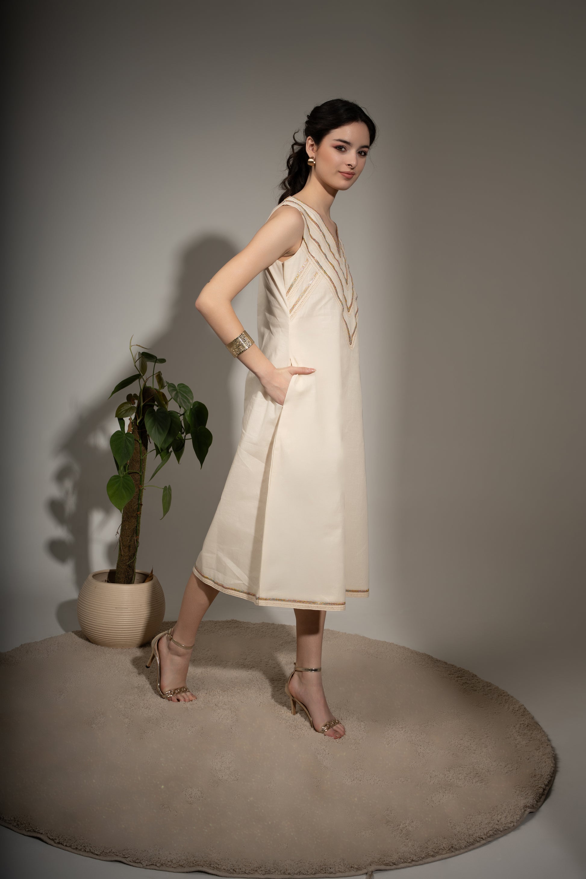 This off-white A-line cambric dress features a sleeveless cut and a playful multicoloured border at the torso forming an abstract pattern. A breezy, modern silhouette that offers both comfort and style in equal measure.