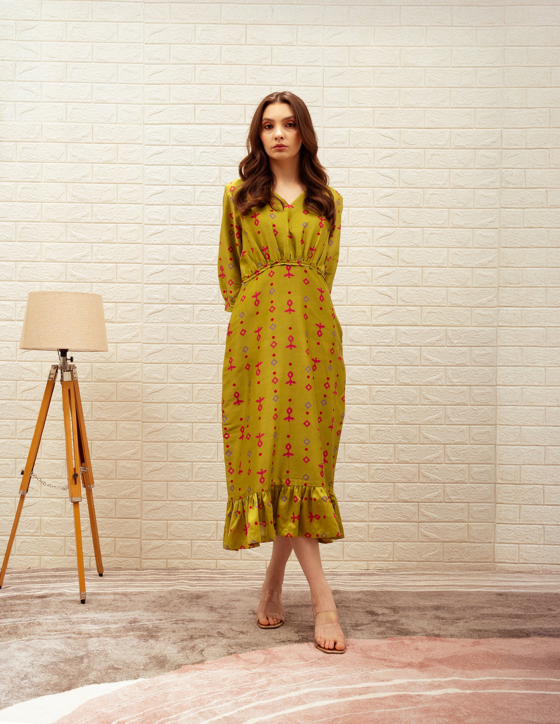 This green printed midi dress features a gathered upper bodice and a defined waistline that flows into a ruffled hem. Finished with a delicate pleated detail and 3/4 puffed sleeves; soft, breathable silhouette, it blends ease with understated charm. Ideal for warm days when you want to feel both polished and free-spirited.