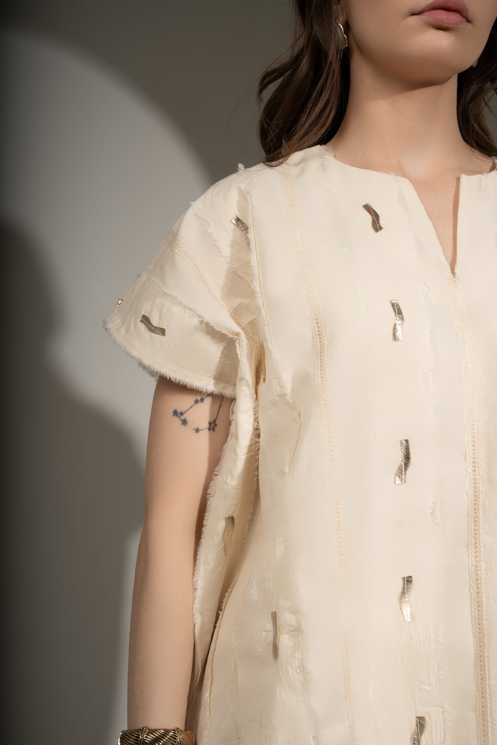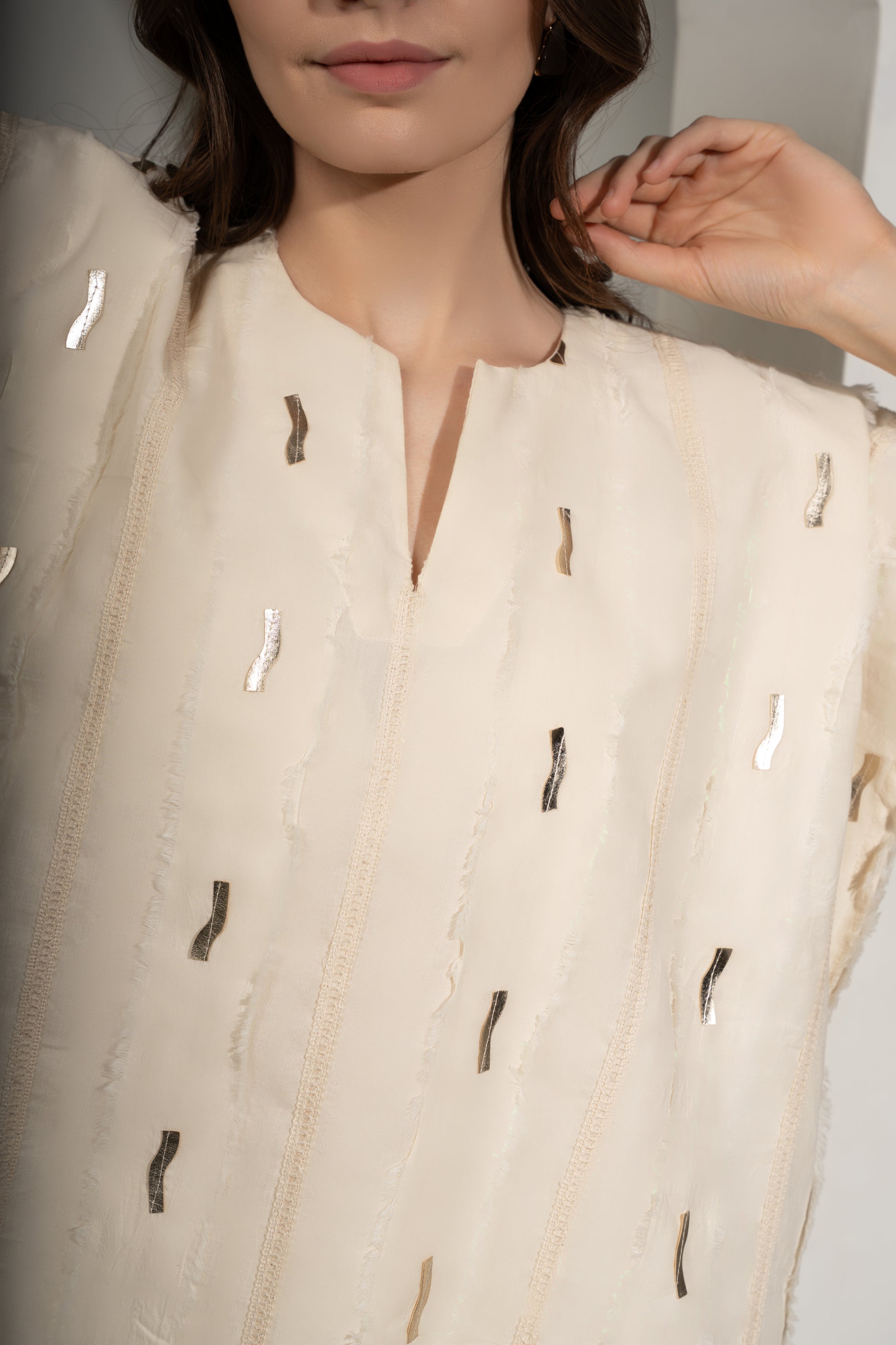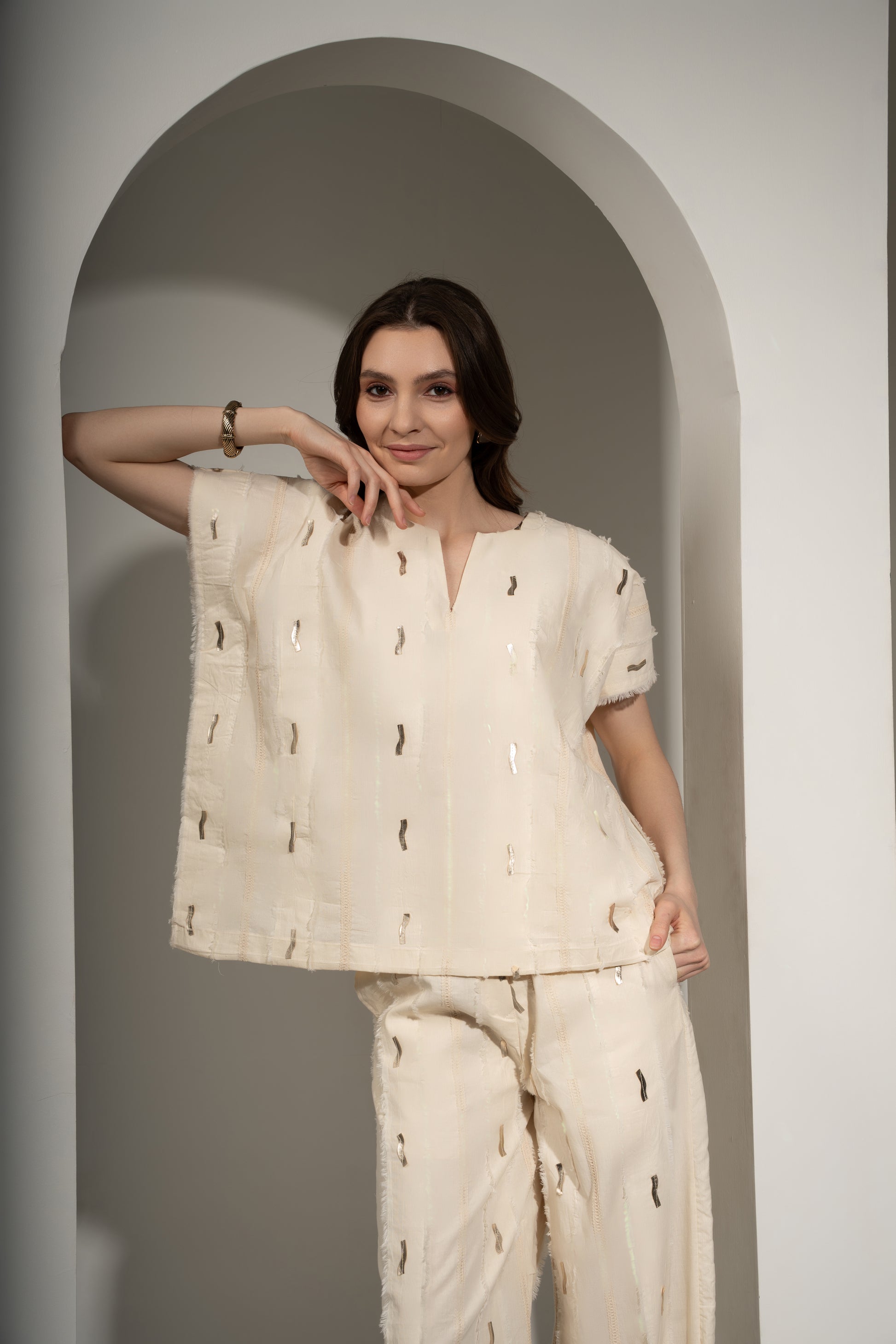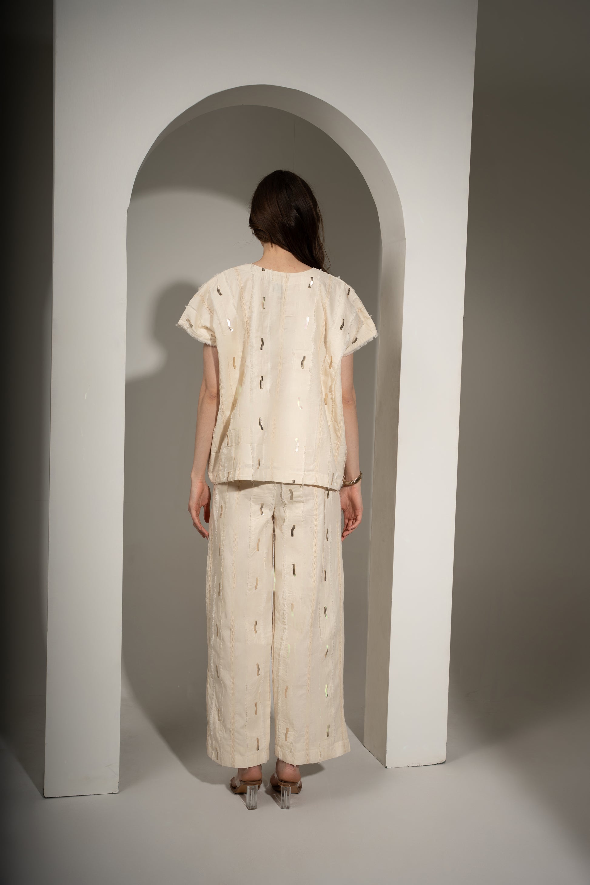A contemporary off-white textured cotton pant with understated detailing, this chic pant has a relaxed, straight silhouette with minimal sophistication. Its subtle texturing brings out the glam once paired with any top.